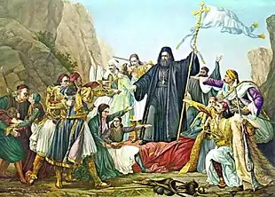 L'histoire officielle (le est l'une des deux fêtes nationales de Grèce) fait commencer la guerre d'indépendance le [N 1], au monastère d'Aghia Lavra à Kalavryta au nord du Péloponnèse. Là, le métropolite de Patras, Germanόs, aurait fait miraculeusement fuir une soixantaine de cavaliers ottomans venus l'arrêter, grâce aux 1 500 paysans grecs présents qui auraient poussé le cri de guerre des Maccabées : « La Victoire de Dieu ». Puis, il célébra un « Te Deum » pour les 5 000 paysans qui s'étaient peu à peu rassemblés. Il prêcha ensuite l'insurrection contre les Turcs, déclarant que les Grecs devraient se battre seuls, sans compter sur l'aide des grandes puissances. Il annonça les événements des provinces danubiennes et de Janina, ainsi que leur défaite ultime qui arriverait nécessairement[53]. Il dit cependant qu'ils servaient la cause grecque, distrayant des troupes qui pourraient écraser la révolte. Il donna alors une absolution préemptive à la foule, distribua aux divers chefs présents (dont Theódoros Kolokotrónis) les tâches qu'ils avaient à accomplir et envoya tout le monde au combat[53].