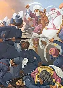 Cependant, Ali Pacha, dans le même temps, essaya d'assassiner un de ses ennemis politiques, Ismaël Pacha, à Constantinople. L'échec entraîna la rupture entre Ali Pacha et la Porte. Le , il annonça ouvertement qu'il se faisait le libérateur des Grecs et reçut en échange l'assurance du soutien de l'Hétairie[40]. Le Sultan envoya d'abord Ismaël Pacha, puis Khursit Pacha, le gouverneur du Péloponnèse, à la tête de milliers d'hommes pris dans les différentes provinces de l'Empire ottoman pour écraser son sujet rebelle. Des pallikares grecs, commandés par des membres de l'Etería, comme Odysséas Androútsos, combattirent dans le camp d'Ali Pacha. Cette mobilisation des troupes ottomanes en Épire servit aussi les vues de l'Hétairie : les autres provinces étaient découvertes ; les combats pour la libération pourraient y être plus faciles[41]. Cependant, en , Ali Pacha, qui tentait un retour en grâce auprès du sultan, dénonça l'Hétairie et ses membres dans des lettres qu'il envoya à Constantinople. Cette trahison fut un des nombreux éléments qui informèrent la Porte de ce qui se tramait, obligeant l'Hétairie à accélérer le cours des événements[42]. Malgré tout, les troupes ottomanes restèrent concentrées autour de Ioannina, laissant le champ libre dans les autres provinces. L'armée de Khursit Pacha, le gouverneur du Péloponnèse, fit le siège de Ioannina, puis du palais d'Ali Pacha jusqu'en [41].