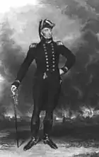 Le , le général de brigade américain William Hull quitta Détroit pour pénétrer au Canada[69], avec une armée composée essentiellement de miliciens. Une fois sur le sol canadien, Hull publia une proclamation ordonnant à tous les sujets britanniques de se rendre, ou « les horreurs et les calamités de la guerre s’abattront sur vous ». Il menaça également de tuer les prisonniers britanniques qui combattaient aux côtés des Indiens. Cette déclaration eut l’effet inverse de celui désiré et contribua à renforcer la résistance face aux attaques américaines.