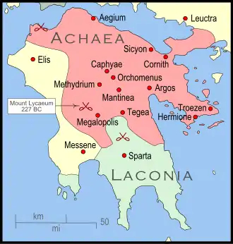 Pendant ce temps, Ptolémée III, allié à la Ligue achéenne lors des guerres contre la Macédoine, transféra son soutien financier à Sparte. Ptolémée prit la décision après avoir calculé qu'une résurgence de Sparte en ferait une alliée plus utile contre la Macédoine que la Ligue Achéenne sur le déclin[10],[11],[12].
