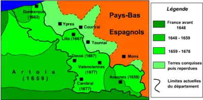 En 1526, le traité de Madrid, en abolissant la vassalité de la Flandre, brisa le dernier lien qui attachait ce pays à la France. Charles Quint l'incorpora aux 17 provinces qui formèrent le cercle de Bourgogne, qui deviendront ensuite les Pays-Bas espagnols en 1549. En 1581, les Provinces-Unies proclament leur indépendance et seuls les Pays-Bas du Sud restent sous domination espagnole.