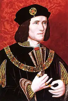 En position de force, Richard peut alors arguer devant le Parlement que le mariage d'Édouard IV et d'Élisabeth Woodville est irrégulier, le défunt roi ayant précédemment promis le mariage à une autre femme, Éléonore Talbot. Cela invalide le mariage suivant (Éléonore Talbot étant décédée après le mariage royal), entraînant l'illégitimité de tous les enfants issus de celui-ci[47]. Cette argumentation est soutenue notamment par l'évêque de Bath et Wells, Robert Stillington, qui affirme avoir célébré la cérémonie entre Édouard et Éléonore. Le Parlement approuve la conclusion, via l'acte Titulus Regius qui fait officiellement le 26 juin de Gloucester le roi Richard III. Les deux garçons emprisonnés, connus comme « les princes de la Tour » (Princes in the Tower), disparaissent à l'été 1483, peut-être assassinés ; l'identité de l'assassin et de ses commanditaires demeure l'un des sujets les plus controversés de l'histoire anglaise[48].