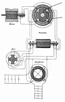 En se fondant sur ses travaux sur les champs magnétiques rotatifs, Tesla développa un système pour la production, le transport et l'utilisation du courant alternatif. Il s'associa à George Westinghouse pour le commercialiser. Westinghouse avait préalablement acheté les droits sur les brevets du système polyphasé de Tesla, ainsi que sur d'autres brevets pour des transformateurs de courant alternatif auprès de Lucien Gaulard et John Dixon Gibbs.