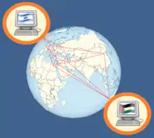 Le « conflit » s'est largement étendu sur le Web. Les versions hébraïque et anglaise de l'encyclopédie en ligne Wikipédia sont ainsi visées par des groupes de pression pro-israéliens proches des colons pour mener ce qu'ils nomment la « bataille de Wikipédia »[17]. Ces derniers ont organisé des cours dont « la stratégie et les objectifs […] sont de former […] une "armée" d'éditeurs […] en leur donnant les compétences professionnelles d'écrire et de modifier le contenu de l'encyclopédie en ligne, d'une manière qui défende et mette en valeur l'image d'Israël »[17],[18],[19]. D'autres supports virtuels, comme Facebook, YouTube et Google Maps, ont également été visés par des groupes de pression pro-israéliens[20].