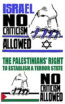 Le même débat que celui ci-dessus relatif à la violence politique palestinienne porte sur la violence politique israélienne qui est tantôt qualifiée de « droit à l'auto-défense » ou de « répression israélienne » et tantôt de « terrorisme d'État israélien »[41] ou de « terrorisme sioniste »[46].