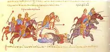 Alors que les Byzantins s’approchaient de Dorostolon, ils rencontrèrent l’armée rous’ déployée dans un champ devant la ville en position de bataille. Après une longue lutte chaudement disputée, les Byzantins l’emportèrent lorsque Tzimiscès fit avancer la cavalerie cataphracte. Les Rous’ rompirent rapidement l’engagement pour se réfugier à l’intérieur de la forteresse[49]. Le siège qui s’ensuivit dura trois mois, les Byzantins bloquant la ville par terre et par mer et les Rous’ tentant plusieurs sorties. Trois batailles rangées eurent lieu, toutes trois remportées par les Byzantins. Lors de la dernière, qui fut particulièrement féroce fin juillet, les Rous’ furent obligés de capituler. Selon les chroniqueurs byzantins, il ne restait plus que 22 000 hommes sur un total de 60 000[48],[50]. Tzimiscès rencontra Sviatoslav et les deux souverains conclurent un traité : l’armée russe était autorisée à partir, laissant derrière elle prisonniers et butin ; ses droits de commerce étaient maintenus pourvu qu’elle fasse serment de ne plus jamais attaquer le territoire impérial. Sviatoslav ne survécut guère à la conclusion de cette paix : il fut assassiné sur la voie du retour, tombant dans une embuscade petchenègue sur le Dniepr[51],[52].