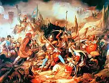 Peinture hongroise du 19e siècle représentant le siège de Belgrade en 1456 ; Jean de Capistran se tient au milieu avec un crucifix dans la main.