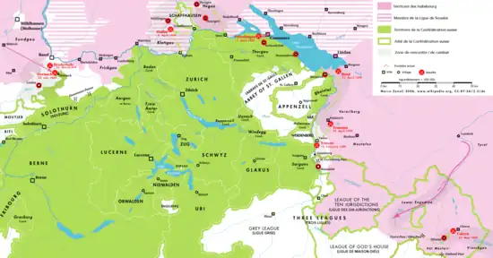 - (de) Cet article est partiellement ou en totalité issu de l’article de Wikipédia en allemand intitulé « Schwabenkrieg » (voir la liste des auteurs).