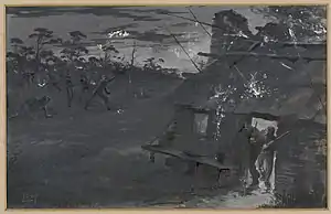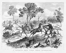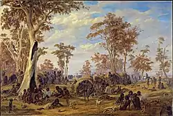 Les réactions des habitants aborigènes à l'invasion soudaine des Britanniques devinrent uniformément hostiles lorsque la présence étrangère conduisit à une compétition pour les ressources et à l'occupation de leurs terres. Les maladies européennes ont décimé les populations autochtones et l'occupation ou la destruction des terres et des ressources alimentaires ont parfois provoqué des famines[26]. Dans l'ensemble, ni les Européens ni les peuples autochtones n'ont abordé le conflit de manière organisée, la « guerre de la frontière » étant davantage un conflit entre des groupes de colonisateurs et des groupes autochtones séparés plutôt qu'une guerre systématique, même si parfois elle impliquait des soldats britanniques et plus tard des unités de police. Tous les Australiens autochtones n'ont pas résisté à l'empiètement européen sur leurs terres ; beaucoup ont également servi dans des unités de police et ont été impliqués dans des attaques contre d'autres tribus[26]. Les colonisateurs ont souvent réagi avec violence, entraînant un certain nombre de massacres aveugles[26] [27]. Les activités européennes qui ont provoqué des conflits importants sont notamment le squat pastoral (l'annexion de pâturages, voir Squatting (Australian history) (en)) et les ruées vers l'or en Australie.