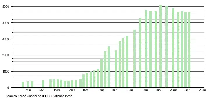 L'évolution du nombre d'habitants est connue à travers les recensements de la population effectués dans la commune depuis 1793. Pour les communes de moins de 10 000 habitants, une enquête de recensement portant sur toute la population est réalisée tous les cinq ans, les populations légales des années intermédiaires étant quant à elles estimées par interpolation ou extrapolation[26]. Pour la commune, le premier recensement exhaustif entrant dans le cadre du nouveau dispositif a été réalisé en 2006[27].