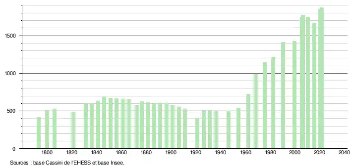 L'évolution du nombre d'habitants est connue à travers les recensements de la population effectués dans la commune depuis 1793. Pour les communes de moins de 10 000 habitants, une enquête de recensement portant sur toute la population est réalisée tous les cinq ans, les populations légales des années intermédiaires étant quant à elles estimées par interpolation ou extrapolation[27]. Pour la commune, le premier recensement exhaustif entrant dans le cadre du nouveau dispositif a été réalisé en 2005[28].