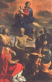 - Vierge à l'Enfant avec les saints Jacques, Roch, Jean l'évangéliste, Sébastien et un pape martyre, 273 × 175 cm, Chiesa di San Nicola, Scheggino