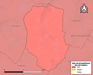 Le retrait-gonflement des sols argileux est susceptible d'engendrer des dommages importants aux bâtiments en cas d’alternance de périodes de sécheresse et de pluie. La totalité de la commune est en aléa moyen ou fort (67,4 % au niveau départemental et 48,5 % au niveau national). Sur les 85 bâtiments dénombrés sur la commune en 2019, 85 sont en aléa moyen ou fort, soit 100 %, à comparer aux 84 % au niveau départemental et 54 % au niveau national. Une cartographie de l'exposition du territoire national au retrait gonflement des sols argileux est disponible sur le site du BRGM[20],[21].