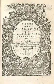 - IV. Livre des chansons de M. Guill. Michel, audiencier. – Paris, Robert III Ballard, 1656. 1 vol 8°, 43 f. RISM M 2664, Guillo 2003 n° 1656-R.