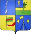 Écartelé : au 1, d'azur, à un sabre d'argent ; au 2, d'or, à un palmier de sinople, terrassé du même, au franc-quartier d'azur au miroir arrondi d'or, le manche accolé d'un serpent d'argent se mirant dans la glace (Monge de Péluse) ; au 3, d'or, à un dextrochère de gueules, tenant un drapeau arabe de sinople à la fasce de gueules ch. de caractères arabes ; au 4, d'azur, à un mât de vaisseau d'or, avec ses cordages, accosté de deux raies du même (de Marey |