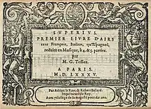 - Premier livre d’airs tant francois, italien, qu’espaignol reduitz en musique à 4 et 5 parties par M. G. Thessier. Paris : Adrian Le Roy et Robert I Ballard, Paris, 1582. RISM T 597, Lesure 1955 n° 254.