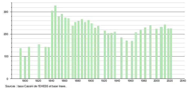 L'évolution du nombre d'habitants est connue à travers les recensements de la population effectués dans la commune depuis 1793. Pour les communes de moins de 10 000 habitants, une enquête de recensement portant sur toute la population est réalisée tous les cinq ans, les populations légales des années intermédiaires étant quant à elles estimées par interpolation ou extrapolation[41]. Pour la commune, le premier recensement exhaustif entrant dans le cadre du nouveau dispositif a été réalisé en 2007[42].