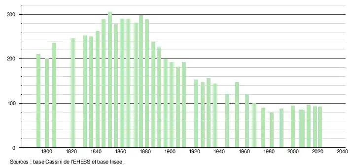L'évolution du nombre d'habitants est connue à travers les recensements de la population effectués dans la commune depuis 1793. Pour les communes de moins de 10 000 habitants, une enquête de recensement portant sur toute la population est réalisée tous les cinq ans, les populations légales des années intermédiaires étant quant à elles estimées par interpolation ou extrapolation[16]. Pour la commune, le premier recensement exhaustif entrant dans le cadre du nouveau dispositif a été réalisé en 2007[17].
