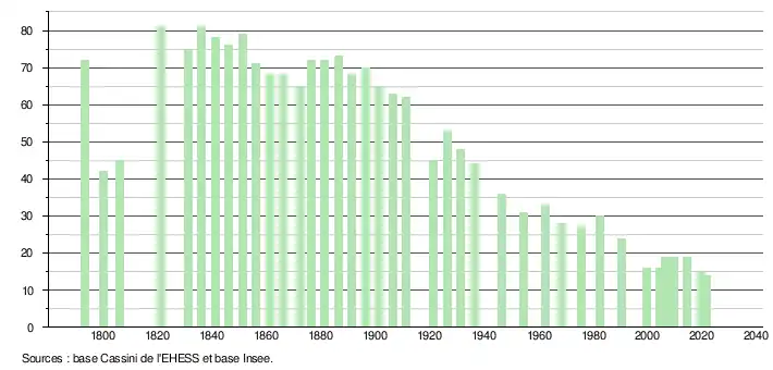 L'évolution du nombre d'habitants est connue à travers les recensements de la population effectués dans la commune depuis 1793. Pour les communes de moins de 10 000 habitants, une enquête de recensement portant sur toute la population est réalisée tous les cinq ans, les populations légales des années intermédiaires étant quant à elles estimées par interpolation ou extrapolation[37]. Pour la commune, le premier recensement exhaustif entrant dans le cadre du nouveau dispositif a été réalisé en 2004[38].