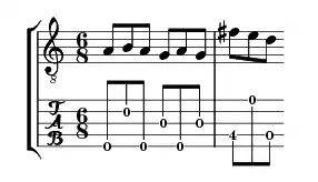 Une utilisation caractéristique de l'accord rentrant est le jeu en campanella (terme italien pour « clochette »), qui consiste à jouer des notes conjointes sur des cordes différentes, chaque note continuant à vibrer lorsque la suivante est jouée, contrairement à ce qui se produit lorsque l'on joue des notes conjointes sur la même corde. Voir ci-dessous un extrait de tablature de Canarios[8] de Gaspar Sanz avec la tablature et les notes produites (avec l'accord no 1 - Gaspar Sanz - ci-dessus)