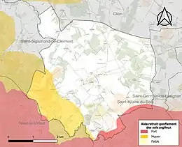Le retrait-gonflement des sols argileux est susceptible d'engendrer des dommages importants aux bâtiments en cas d’alternance de périodes de sécheresse et de pluie. 18,5 % de la superficie communale est en aléa moyen ou fort (54,2 % au niveau départemental et 48,5 % au niveau national). Sur les 253 bâtiments dénombrés sur la commune en 2019, 28 sont en aléa moyen ou fort, soit 11 %, à comparer aux 57 % au niveau départemental et 54 % au niveau national. Une cartographie de l'exposition du territoire national au retrait gonflement des sols argileux est disponible sur le site du BRGM[18],[Carte 2].