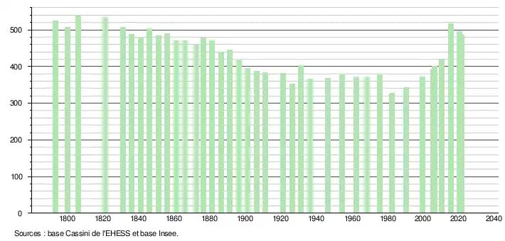 L'évolution du nombre d'habitants est connue à travers les recensements de la population effectués dans la commune depuis 1793. Pour les communes de moins de 10 000 habitants, une enquête de recensement portant sur toute la population est réalisée tous les cinq ans, les populations légales des années intermédiaires étant quant à elles estimées par interpolation ou extrapolation[30]. Pour la commune, le premier recensement exhaustif entrant dans le cadre du nouveau dispositif a été réalisé en 2005[31].