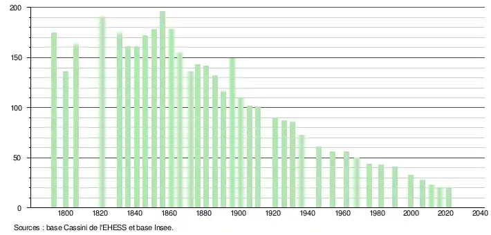 L'évolution du nombre d'habitants est connue à travers les recensements de la population effectués dans la commune depuis 1793. Pour les communes de moins de 10 000 habitants, une enquête de recensement portant sur toute la population est réalisée tous les cinq ans, les populations légales des années intermédiaires étant quant à elles estimées par interpolation ou extrapolation[18]. Pour la commune, le premier recensement exhaustif entrant dans le cadre du nouveau dispositif a été réalisé en 2006[19].
