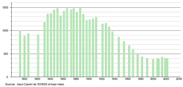 L'évolution du nombre d'habitants est connue à travers les recensements de la population effectués dans la commune depuis 1793. Pour les communes de moins de 10 000 habitants, une enquête de recensement portant sur toute la population est réalisée tous les cinq ans, les populations légales des années intermédiaires étant quant à elles estimées par interpolation ou extrapolation[46]. Pour la commune, le premier recensement exhaustif entrant dans le cadre du nouveau dispositif a été réalisé en 2008[47].