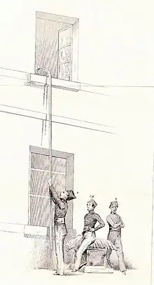 - un appareil respiratoire isolant (appelée Blouse Paulin[10]), pour pénétrer dans les locaux enfumés[11]. Cet appareil était composé d'une cagoule en cuir couvrant la tête et le torse, d'un soufflet et de tuyaux. Un homme à l'extérieur était chargé d'alimenter son collègue en air frais à l'aide du soufflet ;