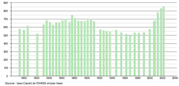 L'évolution du nombre d'habitants est connue à travers les recensements de la population effectués dans la commune depuis 1793. Pour les communes de moins de 10 000 habitants, une enquête de recensement portant sur toute la population est réalisée tous les cinq ans, les populations légales des années intermédiaires étant quant à elles estimées par interpolation ou extrapolation[19]. Pour la commune, le premier recensement exhaustif entrant dans le cadre du nouveau dispositif a été réalisé en 2007[20].