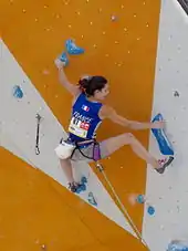 Lors du championnat d'Europe d'escalade de difficulté, à Chamonix, en 2013 | |
