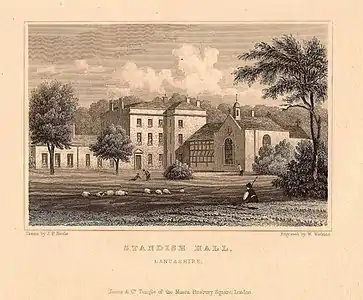 La famille Standish (en) est une ancienne famille de l'aristocratie anglaise dont les origines sont normandes et remontent à la conquête de l'Angleterre par Guillaume le Conquérant, duc de Normandie[16]. La branche aînée hérite du titre de seigneur du Manoir de Standish (en anglais Lord of the Manor) dans le comté de Lancastre. L'un des membres les plus célèbres de cette famille est le capitaine Myles Standish, de la branche des Standish de Duxbury.