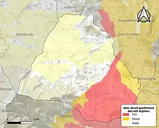 Le retrait-gonflement des sols argileux est susceptible d'engendrer des dommages importants aux bâtiments en cas d’alternance de périodes de sécheresse et de pluie[48]. 30,2 % de la superficie communale est en aléa moyen ou fort (59 % au niveau départemental et 48,5 % au niveau national)[Carte 5]. Depuis le , en application de la loi ELAN, différentes contraintes s'imposent aux vendeurs, maîtres d'ouvrages ou constructeurs de biens situés dans une zone classée en aléa moyen ou fort[Note 9],[49].