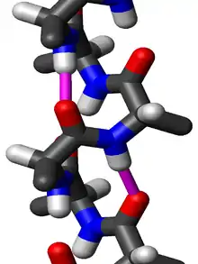 Une hélice 310 est un type de structure secondaire des protéines susceptible de se former aux extrémités des hélices α ou de manière isolée. Les hélices 310 constituent environ 10 % des domaines hélicoïdaux des protéines globulaires[1]. Il s'agit d'une hélice droite dans laquelle chaque tour d'hélice contient trois résidus d'acides aminés et dix atomes dans les cycles formés par les liaisons hydrogène[2]. Une hélice 310 est ainsi définie par la présence d'une liaison hydrogène entre le groupe NH d'un acide aminé et le groupe CO de l'acide aminé situé trois résidus plus tôt ; la répétition de telles liaisons hydrogène i + 3 → i définit l'hélice 310. Il existe d'autres structures du même type, notamment l'hélice α (liaison hydrogène i + 4 → i) et l'hélice π (liaison hydrogène i + 5 → i).