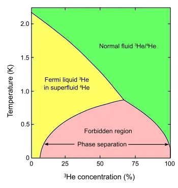 Les deux isotopes de l'hélium ne sont pas complètement miscibles à des températures inférieures à −272,25 °C à leur pression de vapeur saturante. Sous cette température, un mélange de ces deux isotopes subit une séparation de phase où un fluide normal (riche en hélium 3) flotte sur une phase superfluide plus dense (riche en hélium 4). À très basses températures, la phase superfluide peut contenir jusqu'à 6 % d'hélium 3 en solution, ce qui permet de créer un réfrigérateur à dilution capable d'atteindre des températures de l'ordre de 2 mK[8].