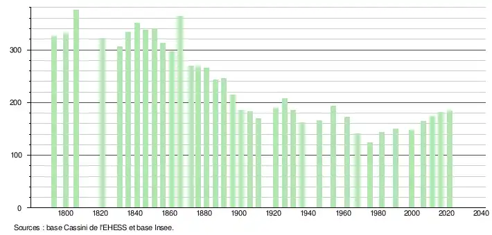 L'évolution du nombre d'habitants est connue à travers les recensements de la population effectués dans la commune depuis 1793. Pour les communes de moins de 10 000 habitants, une enquête de recensement portant sur toute la population est réalisée tous les cinq ans, les populations légales des années intermédiaires étant quant à elles estimées par interpolation ou extrapolation[32]. Pour la commune, le premier recensement exhaustif entrant dans le cadre du nouveau dispositif a été réalisé en 2006[33].