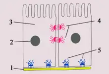 1. Membrane basale, 2. noyau de la cellule, 3. cytoplasme,4. desmosome, 5. hémidesmosome