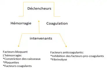 La cascade de coagulation, troisième étape de l'hémostase, entraîne la formation d'un caillot sanguin par l'apparition de facteurs procoagulants. Des mécanismes de régulation se déclenchent ensuite, permettant d'éviter que l'état thrombotique (formation de thrombus, ou caillots sanguins) ne se généralise à toute la circulation (apparition de facteurs anticoagulants). En fin de processus thrombotique, le caillot sanguin est dissous dans le processus de fibrinolyse par l'activation de facteurs spécifiques apparaissant dès le début de la thrombose. L'apparition de l'état de thrombose ou de circulation fluide du sang dépend donc de la concentration de ces différents facteurs à chaque étape de l'hémostase[1].
