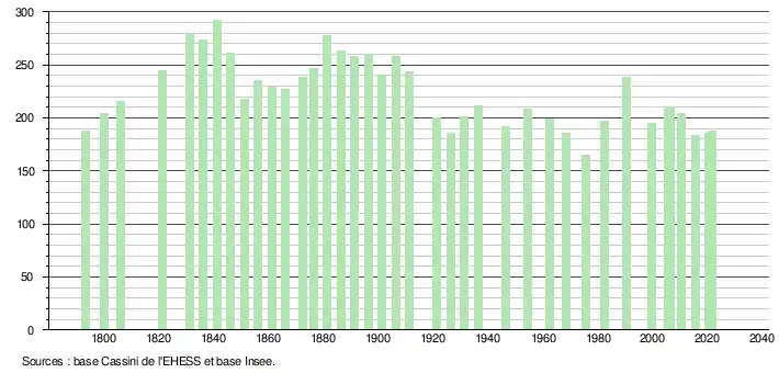 L'évolution du nombre d'habitants est connue à travers les recensements de la population effectués dans la commune depuis 1793. Pour les communes de moins de 10 000 habitants, une enquête de recensement portant sur toute la population est réalisée tous les cinq ans, les populations légales des années intermédiaires étant quant à elles estimées par interpolation ou extrapolation[27]. Pour la commune, le premier recensement exhaustif entrant dans le cadre du nouveau dispositif a été réalisé en 2005[28].