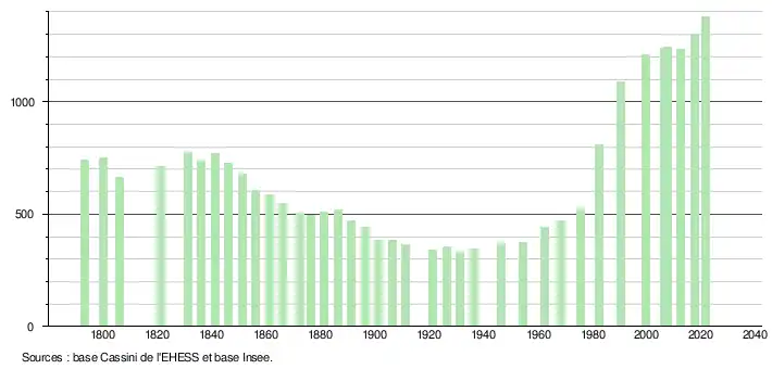 L'évolution du nombre d'habitants est connue à travers les recensements de la population effectués dans la commune depuis 1793. Pour les communes de moins de 10 000 habitants, une enquête de recensement portant sur toute la population est réalisée tous les cinq ans, les populations légales des années intermédiaires étant quant à elles estimées par interpolation ou extrapolation[26]. Pour la commune, le premier recensement exhaustif entrant dans le cadre du nouveau dispositif a été réalisé en 2007[27].