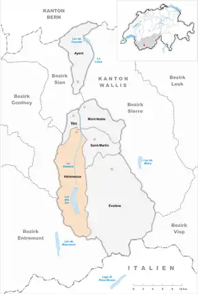 Hérémence (/eʀemãs/) est une commune suisse du canton du Valais, située dans le district d'Hérens, à l'intersection du val d'Hérens et du val d'Hérémence.