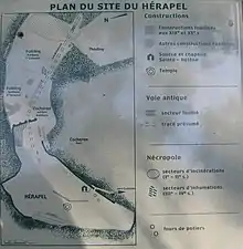 Un système défensif est constitué de deux éléments : d'une part un mur périmétrique dont des fouilles ont permis de retrouver un segment et des fondations sur le bord de l'éperon, et d'autre part une muraille plus importante pour protéger l'accès à l'éperon depuis le plateau. Ce mur était long d'une centaine de mètres et d'une épaisseur moyenne de 2,5 m. Une porte fortifiée donnait accès au site. Un bâtiment octogonal de 32 m de diamètre, probablement un temple, occupait le centre du site. Dans l'Antiquité tardive, le Hérapel est peut-être resté un lieu de culte, aménagé pour servir de refuge à la population en cas de danger.