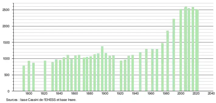 - Population municipale légale en vigueur au 1er janvier 2024, millésimée 2021, définie dans les limites territoriales en vigueur au 1er janvier 2023, date de référence statistique : 1er janvier 2021.