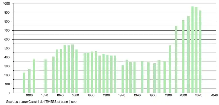 L'évolution du nombre d'habitants est connue à travers les recensements de la population effectués dans la commune depuis 1793. Pour les communes de moins de 10 000 habitants, une enquête de recensement portant sur toute la population est réalisée tous les cinq ans, les populations légales des années intermédiaires étant quant à elles estimées par interpolation ou extrapolation[17]. Pour la commune, le premier recensement exhaustif entrant dans le cadre du nouveau dispositif a été réalisé en 2006[18].