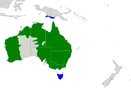 Il est présent dans toute l'Australie à l'exception des zones arides de l'intérieur, et est mentionné régulièrement en Tasmanie et dans le sud de la Nouvelle-Guinée.