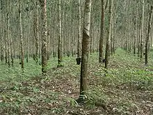 Les vastes monocultures équiennes d'hévéas Hevea brasiliensis se font au détriment de la forêt tropicale[6],[7], y compris dans des pays et sur des continents où l'hévéa n'existait pas.