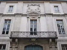 Le décor de la travée centrale comprend, au premier niveau, une clef à tête d'homme barbu grimaçant (mascaron), au deuxième niveau, un décor feuillagé associé au fronton de la porte-fenêtre. Celle-ci s'ouvre sur un large balcon à garde-corps en fer forgé portant les chiffres des Ferraris-Fontette.