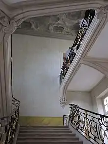 Sous le porche une grande porte vitrée s'ouvre à droite sur l'imposant volume de l'escalier. Cet un exceptionnel escalier à l'italienne à trois volées tournant à gauche. Le départ est enroulé à partir d'un montant rond, il est orné d'arabesques ou se déploient des fleurs de lys et des rinceaux à décor de feuilles. Dans le premier montant de droite, il est orné du chiffre des propriétaires Ferraris-Fontette.