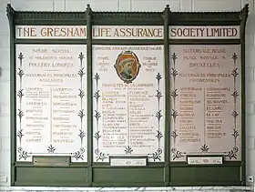 Il est orné d'un grand panneau Art nouveau intitulé « The Gresham Life Assurance Society Limited » et constitué de plaques de marbre blanc enchâssées dans un cadre de bois peint en vert foncé.