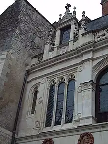 De la façade d'origine, seuls sont conservés l'encadrement et le décor des fenêtres du rez-de-chaussée ainsi que le portail monumental. Le mur et les fenêtres rappellent en tous points le style gothique du palais de Louis XII. On y retrouve les lits horizontaux de briques rouges et de tuffeau blanc mais aussi les culots sculptés de petits personnages grotesques (anges, enfants, homme sauvage, centaure, etc.). Ces héritages du Moyen Âge coexistent avec des éléments beaucoup plus modernes, comme le portail avec ses pilastres cannelés et ses chapiteaux ornés de dauphins et de volutes[4],[17].
